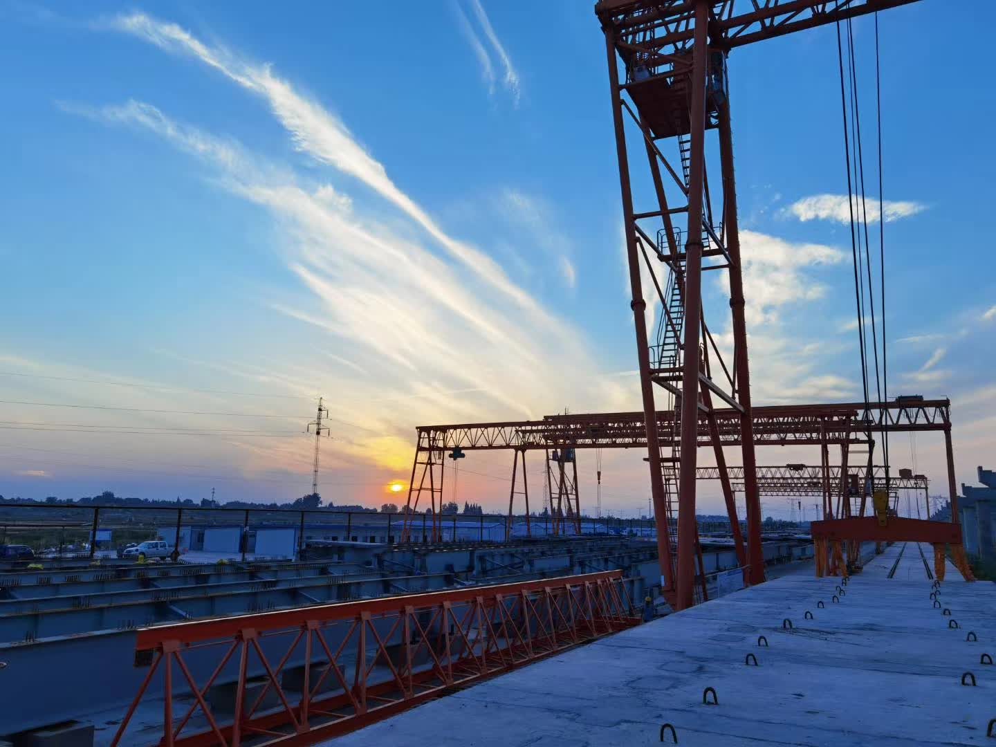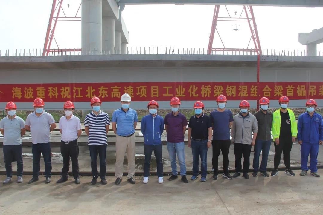 (海波重科新聞報(bào)道)2020年5月26日上午9:00,業(yè)主、項(xiàng)目公司副總經(jīng)理黃遵義、長(zhǎng)江路橋江北東高速項(xiàng)目經(jīng)理王懷才、副經(jīng)理白朝峰、總工楊建波、PC預(yù)制場(chǎng)項(xiàng)目負(fù)責(zé)人及項(xiàng)目副經(jīng)理程波、技術(shù)部部長(zhǎng)歐陽旭、監(jiān)理單位總監(jiān)辦總監(jiān)文輝、副總監(jiān)張貴士、副總監(jiān)趙廷奎、質(zhì)量部部長(zhǎng)鄧再鑫、試驗(yàn)室主任安紅偉、海波重科總經(jīng)理劉乾俊、海波重科項(xiàng)目現(xiàn)場(chǎng)負(fù)責(zé)人閆思為等各位領(lǐng)導(dǎo)、現(xiàn)場(chǎng)作業(yè)人員及媒體記者工作人員共同見證江北東高速項(xiàng)目工業(yè)化橋梁鋼混組合梁首吊的成功。
