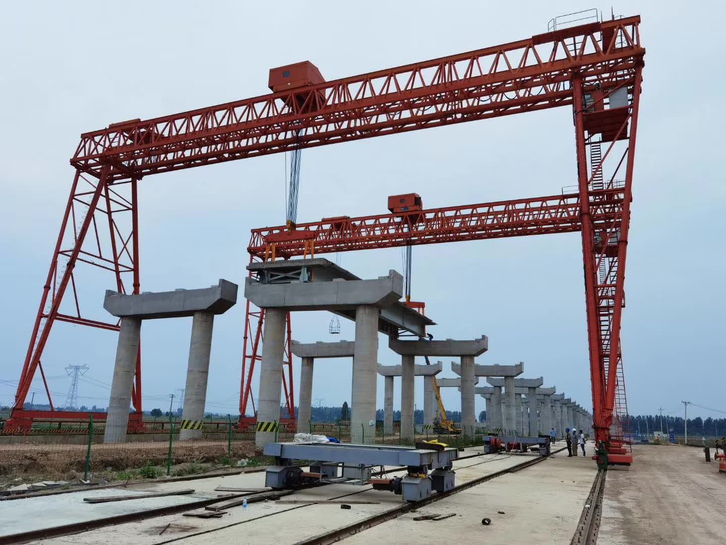 江北東高速公路是湖北省“十三五”綜合交通規(guī)劃重點(diǎn)建設(shè)項(xiàng)目之一,本次吊裝的鋼混組合梁是工業(yè)化橋梁上部結(jié)構(gòu)第一榀梁,位于汊河服務(wù)區(qū)特大橋右幅27孔,單榀梁長(zhǎng)30m、寬6.125m、高1.7m,重134.4噸,利用2臺(tái)125噸跨墩龍門吊進(jìn)行吊裝。本次吊裝的鋼混組合梁由2#疊拼梁場(chǎng)疊拼,采用“開口鋼梁+砼橋面板” 的鋼混組合梁,先簡(jiǎn)支后橋面連續(xù)。
