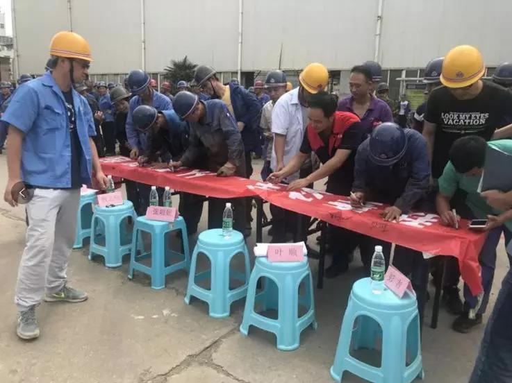 接著由敖志碩給全體員工講解了滅火要點,為了將所學(xué)知識付諸實踐,“趁熱打鐵”在員工中普及滅火器的使用方法,講解結(jié)束后,在廠區(qū)四跨前面舉行了滅火器滅火演練比賽,由公司領(lǐng)導(dǎo)打分,最終技術(shù)部獲得第一名,下料機加車間獲得第二名,總經(jīng)辦第三名。在滅火器滅火實戰(zhàn)演練比賽后,進行了“我要安全,從我做起”的宣誓簽字活動,全體員工進行簽字活動
