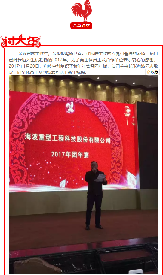 新年伊始,萬象更新,又是一個生機蓬勃的春天向我們走來。值此新春佳節(jié)之際,我謹代表海波重型工程科技股份有限公司向全體嘉賓及員工致以衷心的感謝,向各崗位努力工作的全體員工及家屬致以崇高的敬意。祝愿大家在新的一年里身體健康、萬事如意、闔家歡樂、事業(yè)有成!